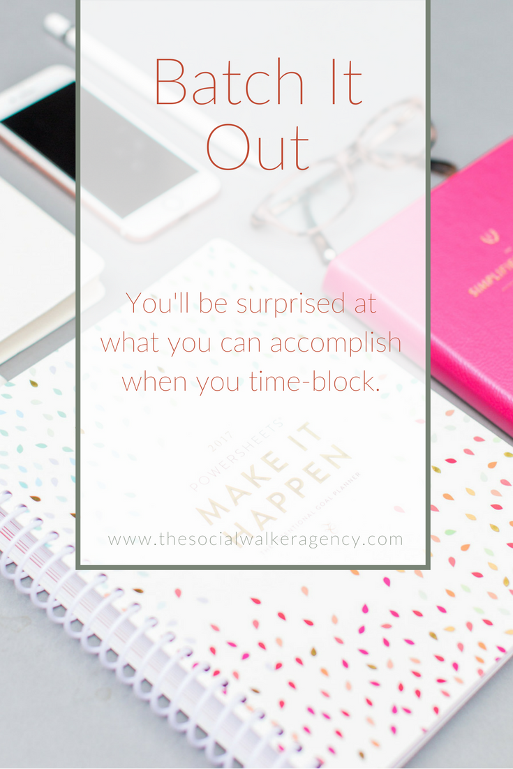 So what does "Batch Day" even mean? Its the day you get all your work or tasks done. Sit down one day and write down all the things you need to do for that month (or the following month). Then pick one day where you have a good chunk of free time and just start tackling that list. Batch it by project too! Do you write better in the AM and can crank out those graphics later in the day? Then do it! Don't stop and start different things on Batch Day. Get it done.