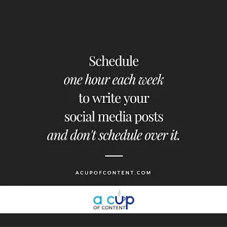 For example, the first Monday of every month can be spent writing / outlining blog posts for the month. Tuesday is graphics day and Wednesdays, you just post the blog and push it to Social Media. Why is this a great way to get things done? I don't know about you, but when I get in writing mode, I can pump out some content! But stopping to create graphics along the way slows my writing mojo. You can also batch your social media out as well! The last Friday of every month, go a head and schedule your social media and then add in your blog graphics as you go.